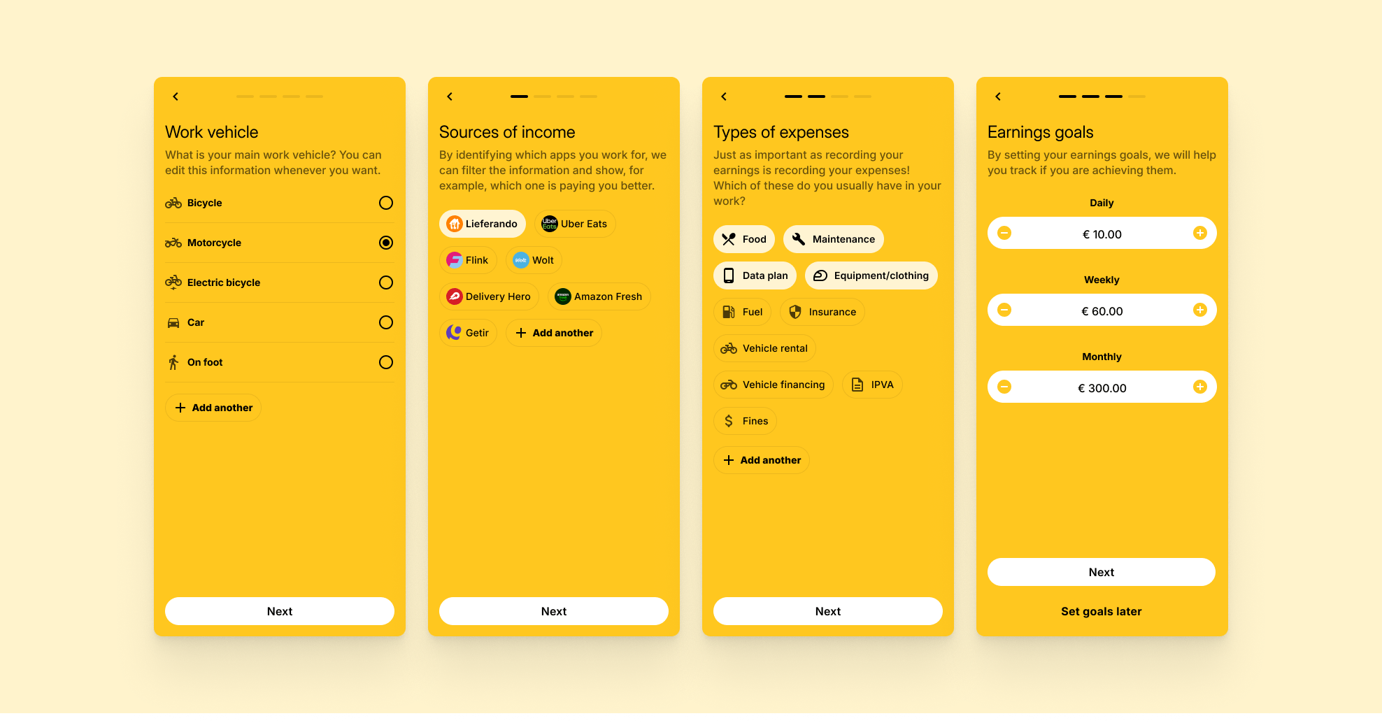 The winner concept was the “Financial Strava”, a kind of app that would merge the popular sports-tracking app Strava with the specificities of their work as delivery workers. The user would add their earnings and expenses to the app, which would help them track their daily and weekly goals and calculate some personal performance metrics.
